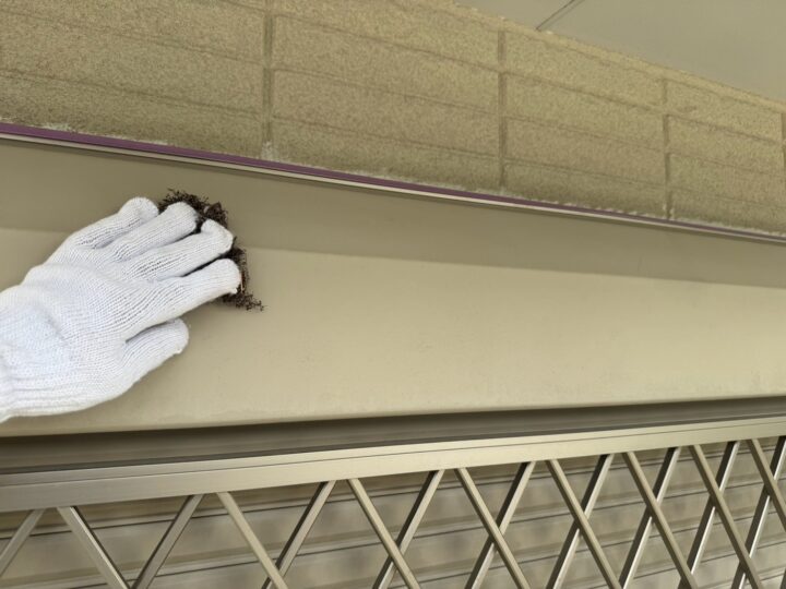 具体的には、ワイヤーブラシなどで浮いている錆や剥がれかけた古い塗膜を徹底的に除去します。付帯部 サビ止め塗布作業