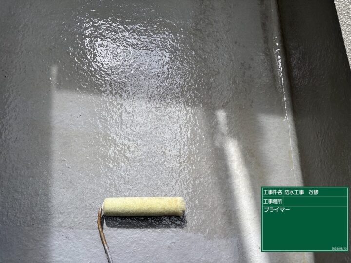 プライマーは、床面と防水層の間で接着剤のような役目をします。ベランダ防水工事