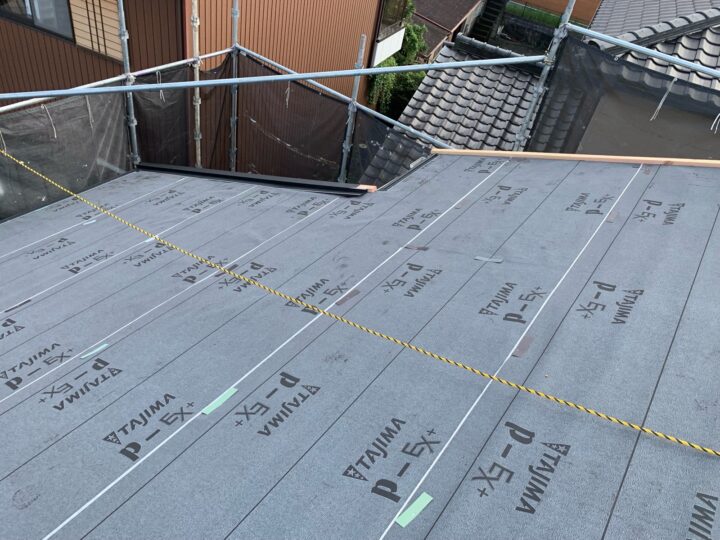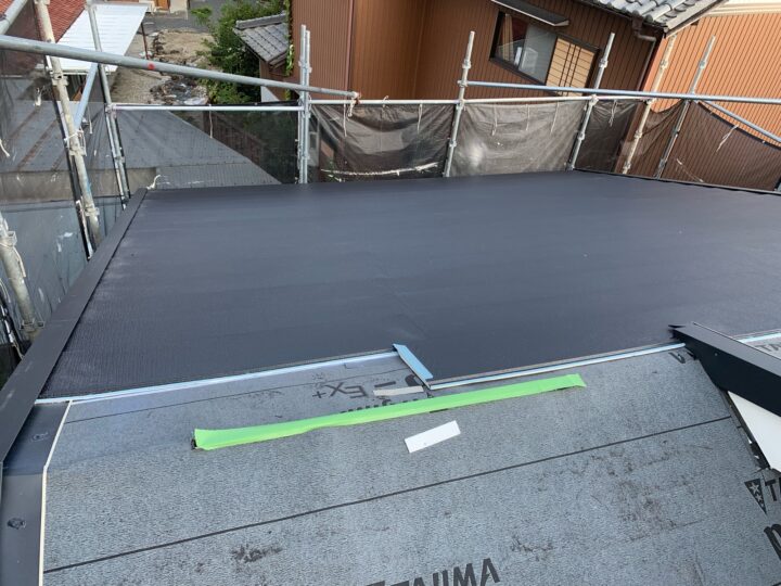 屋根の内部に水が入るのを防くため、軒先水切り板金を張ります。