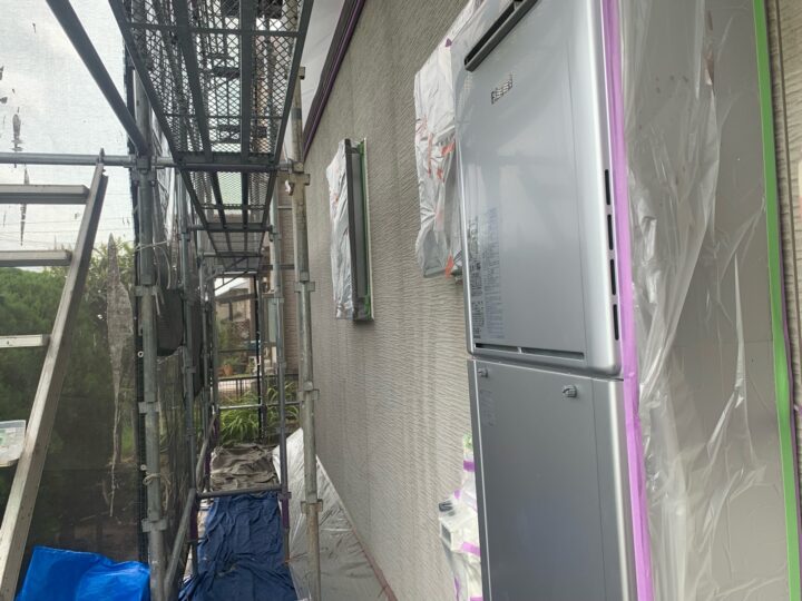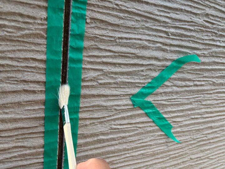 外壁にプライマー(下塗り材)やシーリング剤を付けないために、マスキングテープを貼っていきます。
