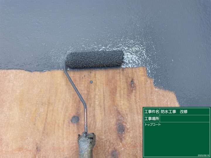 この2回目の塗布は、1回目と合わせて規定の防水層の厚みを確保し、防水性能をさらに確かなものにするための重要な工程です。