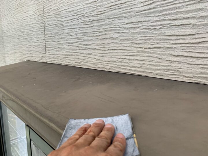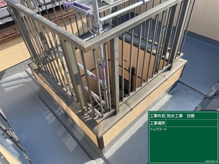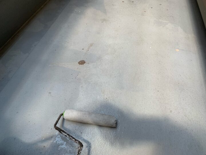 片方のベランダは、現状の防水層に問題がないため、今回の塗装は、既存の防水層をさらに保護するための工法を採用します。