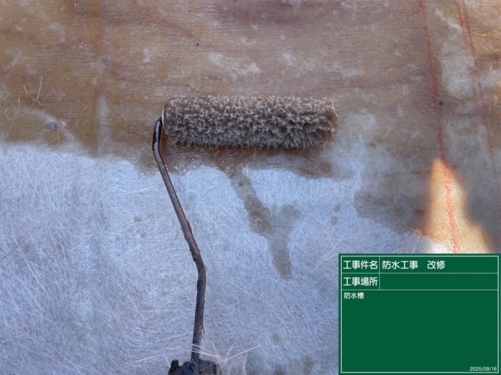 防水用ポリエステル樹脂と防水ガラスマットで防水層を作り、耐衝撃性や耐摩耗性が期待できます。