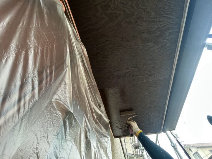 養生をしっかりと行うことで、仕上がりの美しさが格段に向上し、お客様の大切な財産を汚すことなく、高品質な塗装工事を実現します。軒天 塗布作業