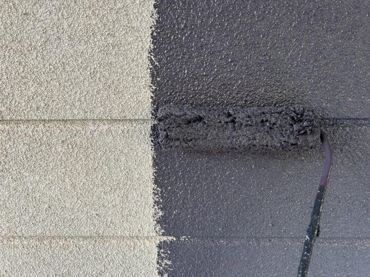 中塗りは、下塗りと上塗りの中間に塗り付ける層の工程であり、平滑な下地を作ることや、上塗り材の補強が目的となります。屋根 上塗り作業