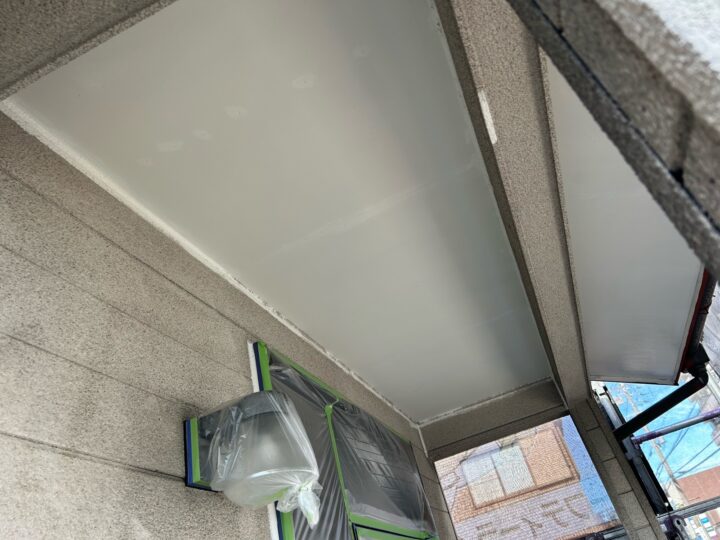 養生には、マスキングテープやビニールシート、飛散防止ネットなど、様々な資材が使われます。軒天 塗布作業