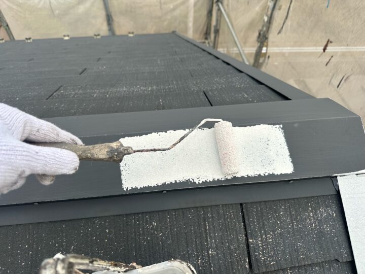 棟板金をサビから守るため、下塗り材にサビ止め塗料を使用します。