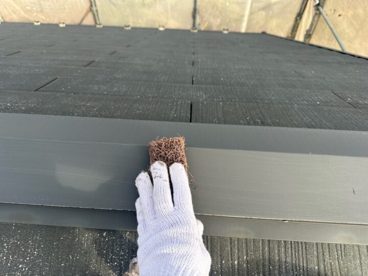 塗料で屋根材の隙間を埋めてしまわないように縁切りの作業を行います。