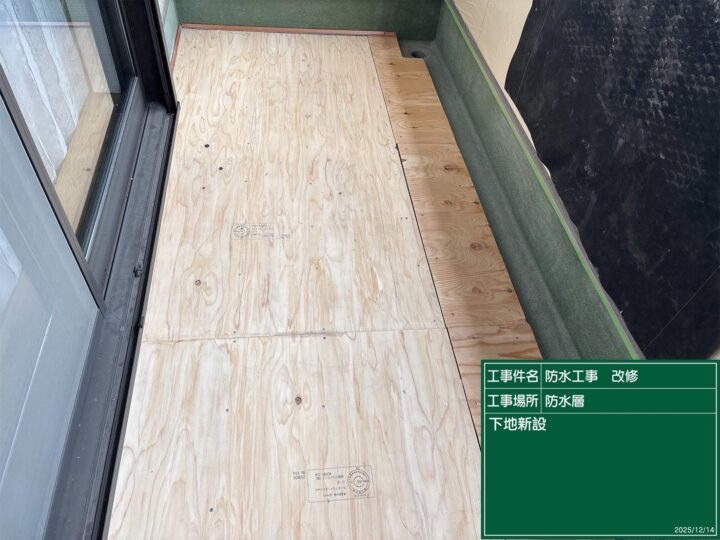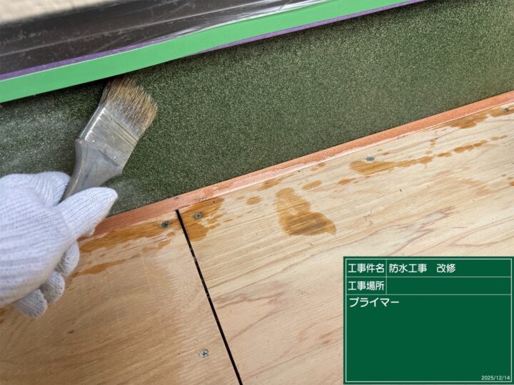 下地のコンパネとFRP防水層を強力に結びつける「接着剤」の役割を果たす工程です。
