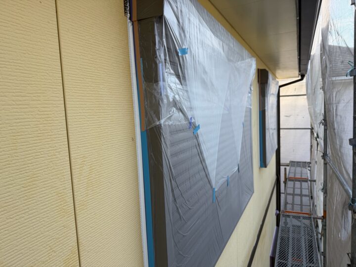 外壁にプライマー(下塗り材)やシーリング剤を付けないために、マスキングテープを貼っていきます。