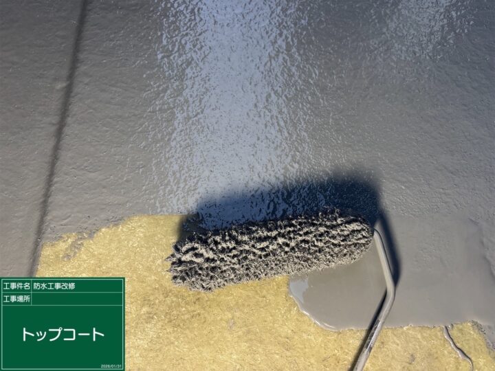 これにより、過酷な直射日光や雨風にさらされても劣化しにくい、美しさと強さを兼ね備えた最高品質の防水面が完成します。