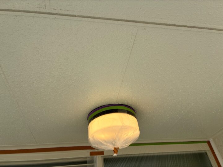 塗装に入る前に、窓サッシやベランダ、床面などをビニールシートで覆う「養生」を行います。