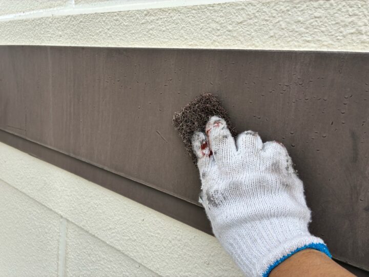 表面の汚れを落とすと同時に、あえて細かな傷をつける「目荒らし」をすることで、塗料が密着するようになります。
